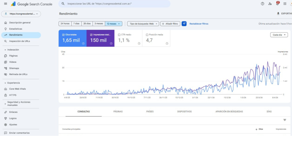 - Posicionamiento por volumen de keywords con intención real — Congreso Dental hoy tiene 37 keywords en el Top 3, 150.000 impresiones mensuales y un 40% más de consultas respecto al mes 6